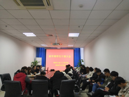 2月28日中午,物理与电子工程学院新学期学生干部大会在四教楼503会议室召开,学院党总支副书记李玲、辅导员老师、学生会主要学生干部及各班班长、团支书参加了会议。