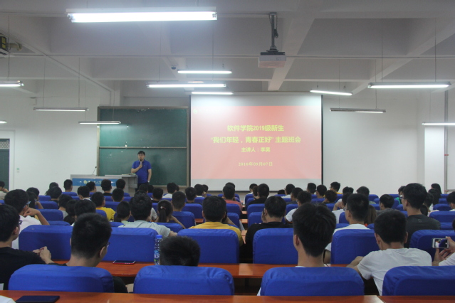 为了使2019级新生尽快转变角色,顺利融入大学生活,2019年9月07上午9:00,软件学院举行了新生入学教育之“你们年轻,青春正好”主题班会。与会人员有新生辅导员李昊老师、冯文老师、贾晓龙老师以及软件学院2019级全体新生。