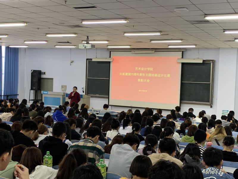 2019年9月16日上午,艺术设计学院在教三楼302举行了庆祝新中国成立70周年新生主题绘画设计比赛表彰大会及新生军训动员会。大会由孙丰老师主持,黄鑫慧老师和2019级全体新生共同参与。