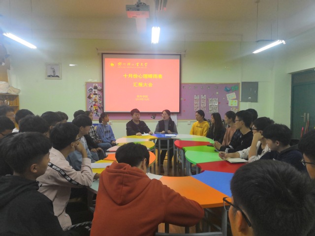 会议开始,李辉老师先对十月份学院开展的心理健康工作进行了总结;李老师对本月开展的心理测试、心理嘉年华活动、参观心理健康指导中心及蒲公英项目的申报及立项工作一一进行了梳理,对工作中存在的问题和学生干部们进行了讨论并形成进一步的解决方案。接下来,李老师布置了下阶段蒲公英项目的具体实施工作,并提出相关要求。最后,李老师带领大家一起分析心理晴雨表中班级学生出现的心理方面的问题和困惑。并就共性问题“室友之间的矛盾纠葛”、“学习和生活应该怎么调节?”等问题展开激烈的讨论,大家纷纷发表自己的理解和观点,并提出解决方法,李老师在汇集大家建议的基础上,给出了指导性意见,并要求心理委员能够把学到的技能和心理知识迁移到工作中去,为同学们的心理困惑排忧解难。