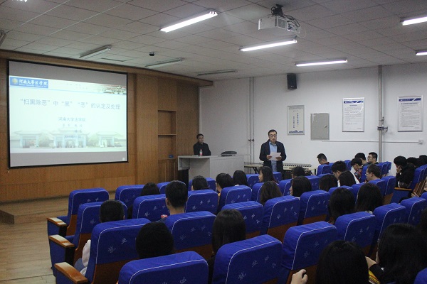 1115日,河南大学法学院院长蔡军教授应我校政法学院邀请,在科学校区学生活动中心113做了题为“扫黑除恶中‘黑’‘恶’的认定及处理”的学术报告。报告由政法学院刘春兵院长主持,政法学院相关专业教师、法学2017级和2018级本科生参加了报告会。