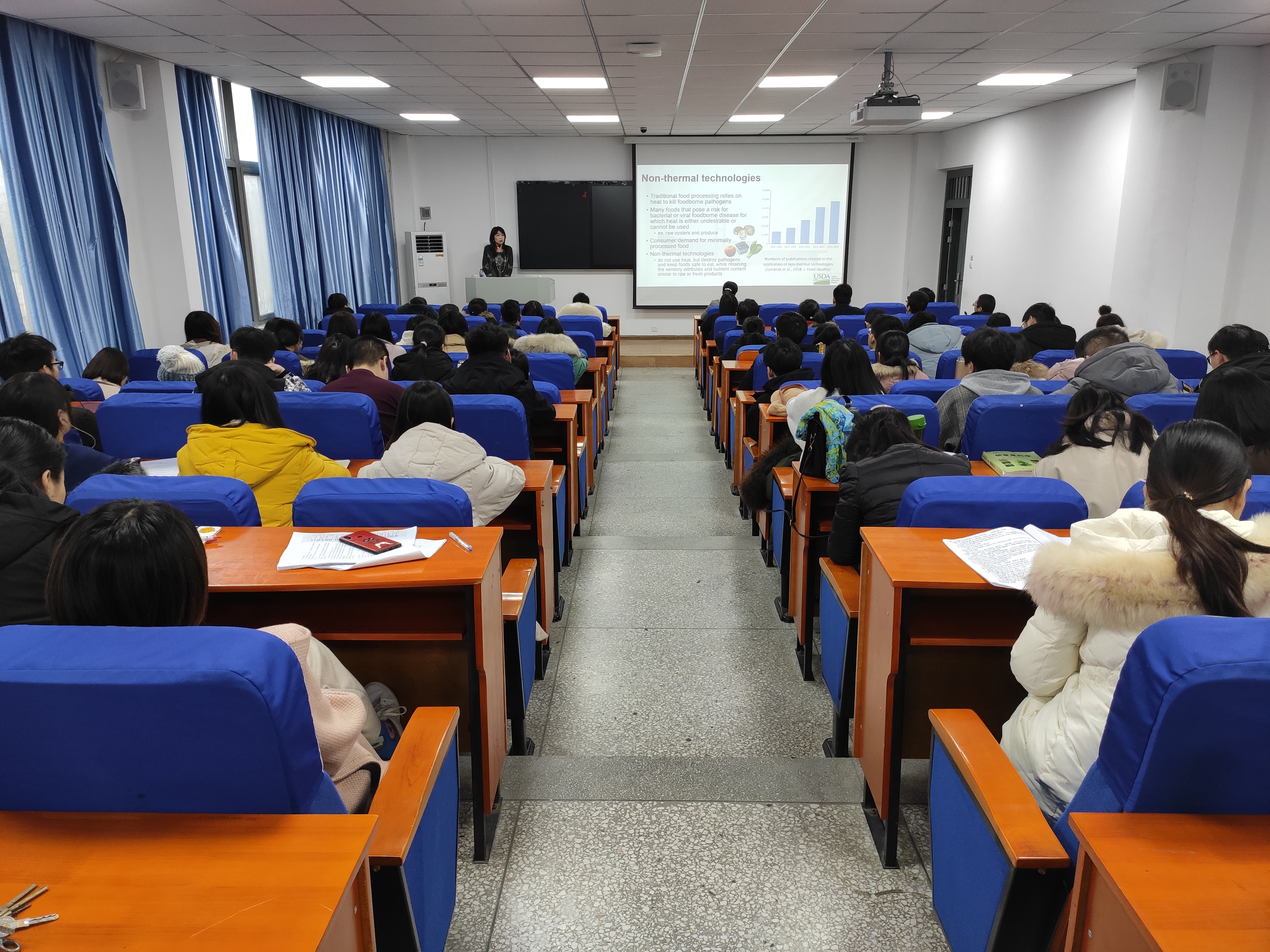 1月6日,应我校食品与生物工程学院(烟草科学与工程学院)和河南省冷链食品质量安全控制重点实验室邀请,美国农业部西部研究中心农产品质量安全和微生物学研究所主任、首席科学家Vivian C.H. Wu教授来我校做题为“Non-Thermal Technologies for the Safety and Quality of Our Food”的学术报告。报告会在科学校区食工楼209室进行,相关老师和全体研究生参加了报告会,报告会由白艳红院长主持。