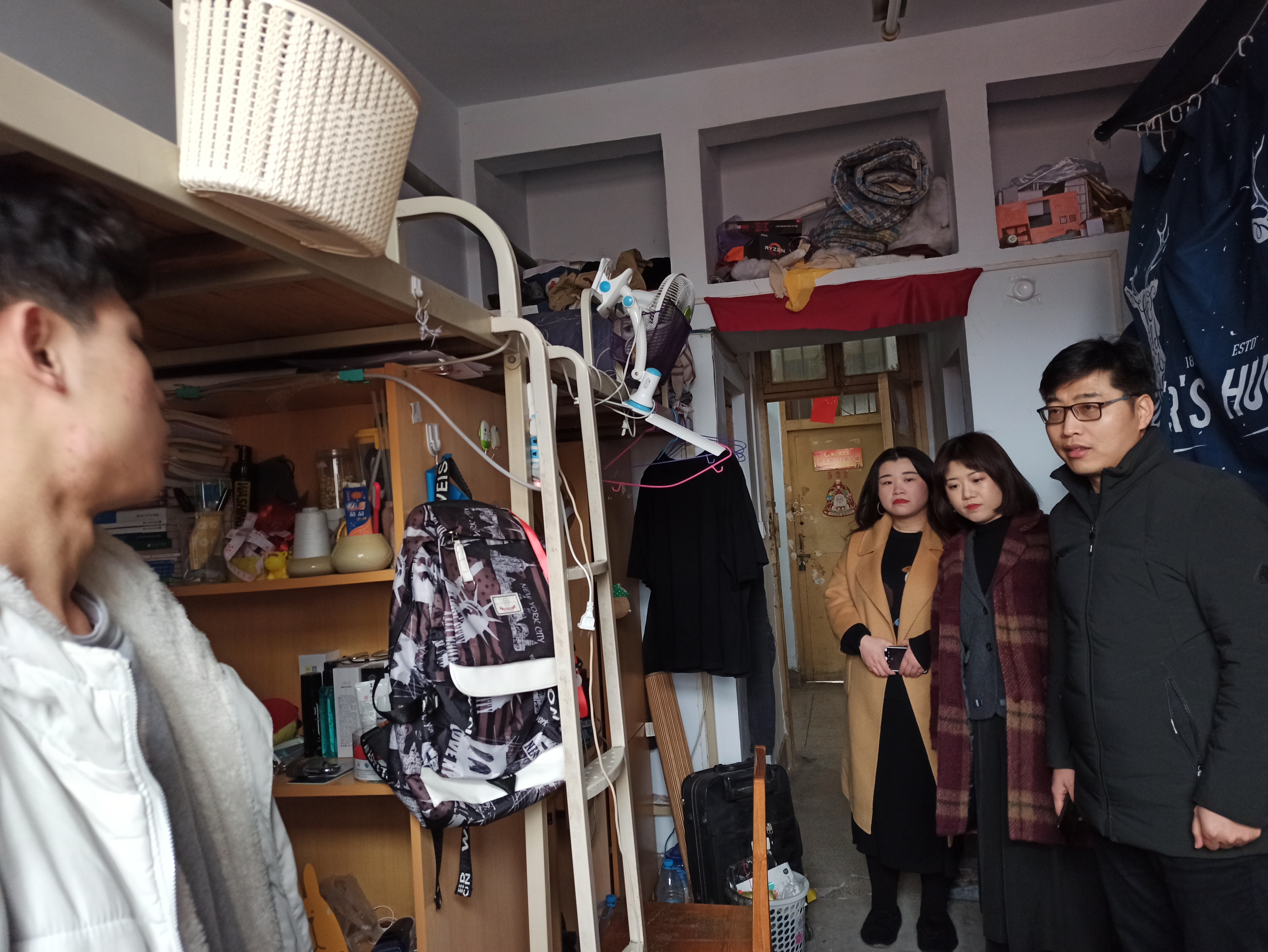 老师们每到一个宿舍都与同学们亲切交谈,了解学生假期安排,关注学生去向。贾书记提醒学生在离校前收拾好个人物品,认真检查宿舍的卫生安全,关好门窗和电源,尤其在学生回家途中注意个人的人身和财产安全。同时也希望学生能合理利用假期时间查漏补缺,做好相关课程的复习与预习。