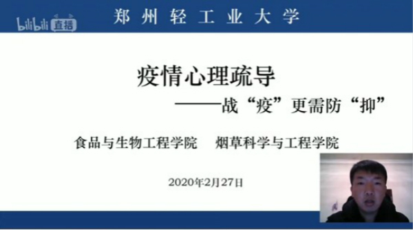 为进一步引导同学理性认识疫情期间情绪变化,在战“疫”的同时学会自我疏导,促进身心健康发展,食品与生物工程学院(烟草科学与工程学院)于2月27日开展战“疫”更需防“抑”心理疏导会,本次心理辅导采用哔哩哔哩视频直播,由学院心理健康专职辅导员何春雨老师主持,我院全体学生参与。