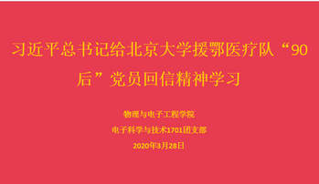 为引导同学们坚定理想信念,勇担重任,增强在艰苦奋斗中砥砺意志品质。3月27日至31日,物理与电子工程学院各团支部开组织学习了习近平总书记给北京大学援鄂医疗队“90后”党员回信精神团日活动,此次活动采用线上直播和网络研讨等形式进行。