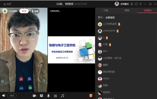 4月7日下午,物理与电子工程学院在线开展毕业生就业工作推进会,16级辅导员周芳华,就业工作专职人员王伟夙,全体16级学生参与了会议。