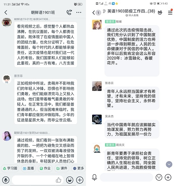 各个团支部通过钉钉班群、腾讯会议、qq直播间等各种形式组织广大团员观看了广大人民驰援武汉的视频,感受到了中国力量、中国速度和中国精神;讲解了各国在这场对抗疫情大考中的不同做法,体会到中国特色社会主义制度的优势;介绍了我国广大90后、00后青年在此次战“疫”中的突出贡献,再次深入学习习近平总书记给北京大学“90后”党员的回信及精神;分享了身边志愿者的感人故事,将无私奉献、砥砺奋斗的精神深入人心。