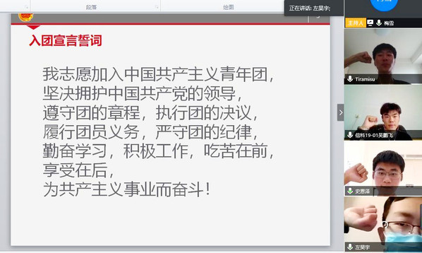 为引导团员青年继承和发扬爱国主义精神,纪念五四运动101周年,5月1日下午15点,数学与信息科学学院组织部分学生团员和2019年新入团的7名同学,以“重温入团誓词,牢记初心使命”为主题,开展“云”端团日活动。