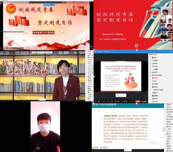 主题团日活动通过QQ群、钉钉等线上平台,通过观看视频、PPT讲解、线上讨论、志愿者分享故事等多种方式组织学院广大团员青年参与本次主题团日活动。其中材料物理2017级1班团支部通过分享战“疫”志愿者高亚伟同学的战“疫”经历,学习他不畏艰险、冲锋在前、真情奉献的青年担当精神。电子科学与技术2017级1班团支部、2018级2班团支部、2019级3班团支部通过学习《战“疫”烽火,点燃青春赞歌》主题团课,以及抗疫一线医护人员的先进事迹,激励同学们充分发挥当代团员青年在疫情攻坚战中的堡垒作用。材料物理2019级1班团支部用PPT讲解了“五四精神”“战‘疫’中的五四青年”“坚定制度自信”三个方面内容,鼓励同学们继承和发扬五四精神,坚定制度自信。通过学习,同学们纷纷表示会坚定理想信念,练就过硬本领,不负习近平总书记的殷殷嘱托,承担起新时代赋予的责任和使命。