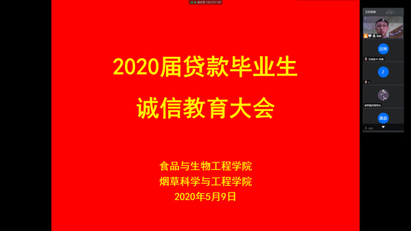 59日下午,食品与生物工程学院通过腾讯会议召开了2020届贷款毕业生诚信教育大会。学院负责资助工作的李皓老师及全体贷款毕业生参加了此次会议。