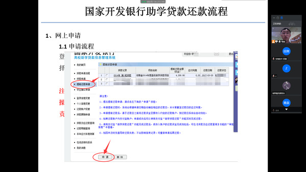 会上,李皓老师首先向同学们介绍了国家助学贷款还款流程。随后从贷款毕业生按时还款的重要性、贷款违约必须承担的后果、贷款毕业生信息确认流程等方面做了详细介绍。并结合实际案例向大家讲述了贷款逾期违约对个人征信的影响和严重后果。提醒同学们注意毕业确认和贷款到期的重要时间节点,鼓励有条件的贷款学生提前还款。同时提醒大家要谨防不法分子利用助学贷款的名义向同学们行骗,要求同学们对收到的信息仔细辨别,以防被骗。希望同学们自立自强,诚实守信,怀揣对国家、社会和学校的感恩之情,以优异的成绩回报国家和社会。