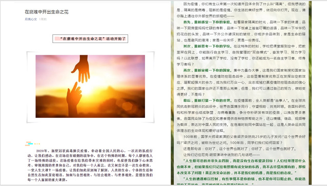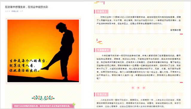 活动分为生命教育知识普及和个人生命感悟两个板块。经过素材选取,内容整理确定生命教育的相关知识,依托学院心理部官方微博、公众号作为生命教育的知识宣传普及平台。同学在充分了解生命健康教育知识后纷纷积极投稿,动人的语句表达了同学们对、自然、未来以及人生的感悟,感人的图片更是发人深思。活动的最后把同学们的生命感悟和创作作品通过公众号推送分享,充分体现生命教育的时度效。