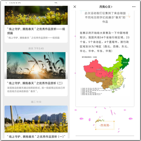 在心理健康专职辅导员胡新月老师的指导下,学院心理部经过前期的准备和讨论,确定了本次活动的方案。通过微博、QQ群等线上宣传预热,活动正式开始。本次活动得到了同学们的积极反馈,先后收到来自全国各地的一百多幅作品,优秀作品通过学院公众号进行分享交流。同学们通过拍照的形式展现了疫情过后自己家乡的“春天”,有熙熙攘攘的人群,花红柳绿的春景,川流不息的车辆,还有自己的生活的小确幸;同样还有同学们自己拍的短视频,配上优美的音乐和录制的美好时光,展现了同学们发现“春”的眼光;更有绘制了插画和设计稿的同学,表达了自己对“春”的理解、感受和期待。
