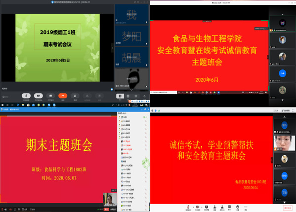 为进一步提升学生诚信意识,严肃考风考纪,深入推进学风建设,6月3日至7日,食品与生物工程学院(烟草科学与工程学院)以班级为单位召开了学业警示暨诚信考试线上主题教育会议。