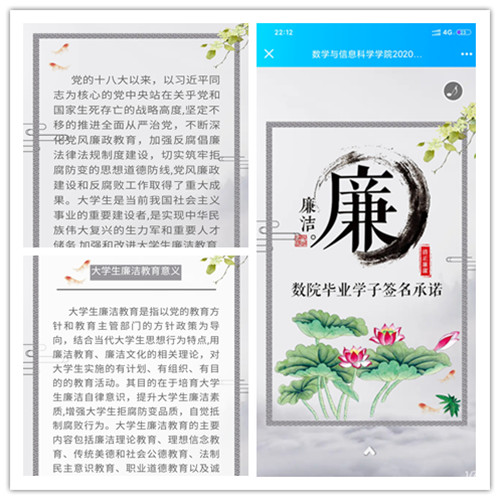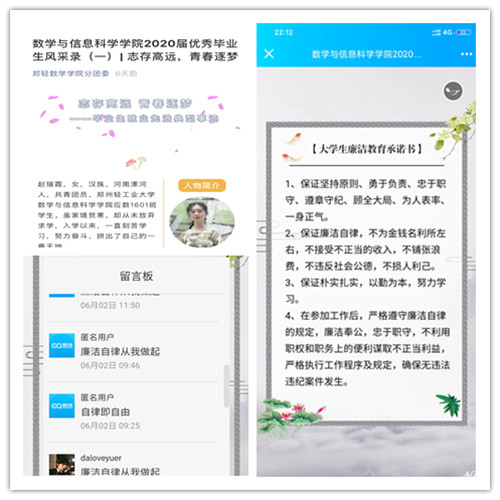 其中,在毕业生离校之际,数学学院于微信公众号推出了“优秀毕业生风采录”等毕业季专题系列活动推送,通过立标杆、树典型的形式,引导同学们树立积极健康的人生观和价值观;同时,积极组织毕业生在“云”端进行廉洁承诺签名,提醒同学们务必重视廉政思想,做廉洁之人,行廉洁之事,树廉洁之心。小小的签名,是毕业生对今后廉洁从业的慎重承诺。