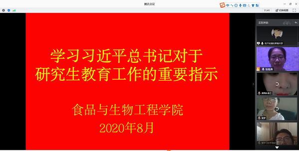 为深入学习贯彻习近平总书记对于研究生教育工作的重要指示精神,8月1日中午1点,食品与生物工程学院组织全体研究生通过自主学习和线上集中学习相结合的方式学习习近平总书记对于研究生教育工作的重要指示精神。