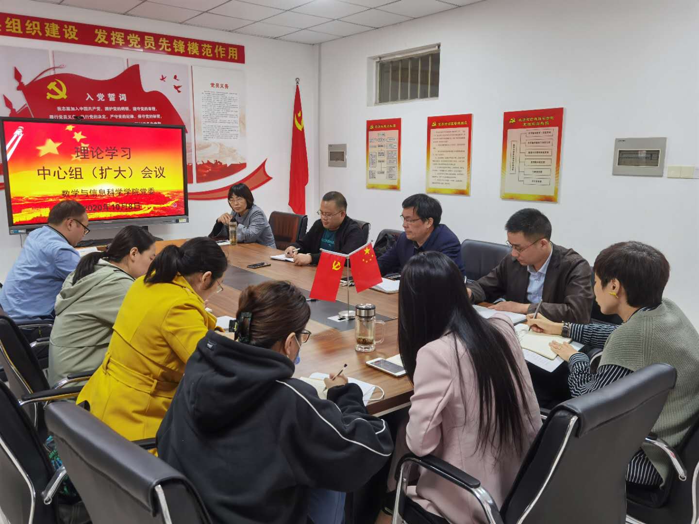 10月8日下午,数学与信息科学学院在东一楼205会议室召开党委理论学习中心组(扩大)学习会议,专题学习习近平总书记在教育文化卫生体育领域专家代表座谈会上重要讲话和《中国共产党基层组织选举工作条例》。学院全体党委委员和各党支部书记参加会议。会议由党委书记郭晓丽主持。