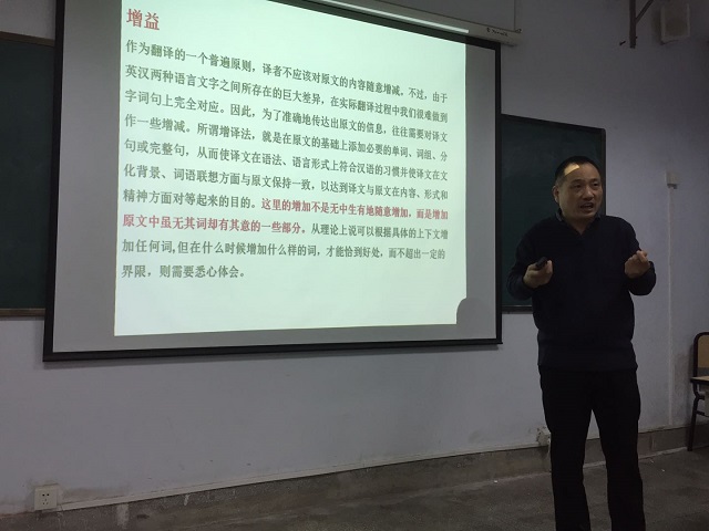 闫老师首先向学生们深入分析了“增益法”的概念,指出“增不是无中生有地随意增加,而是增加原文中虽无其词却有其意的一些部分”。接着他又重点讲授了增益法在翻译实践中的具体方法和技巧。最后闫老师引用《奈达论翻译》的一句话:“好的译文一般都会略长于原文”,总结了在英译汉的实践中增补的普遍存在和重要作用。