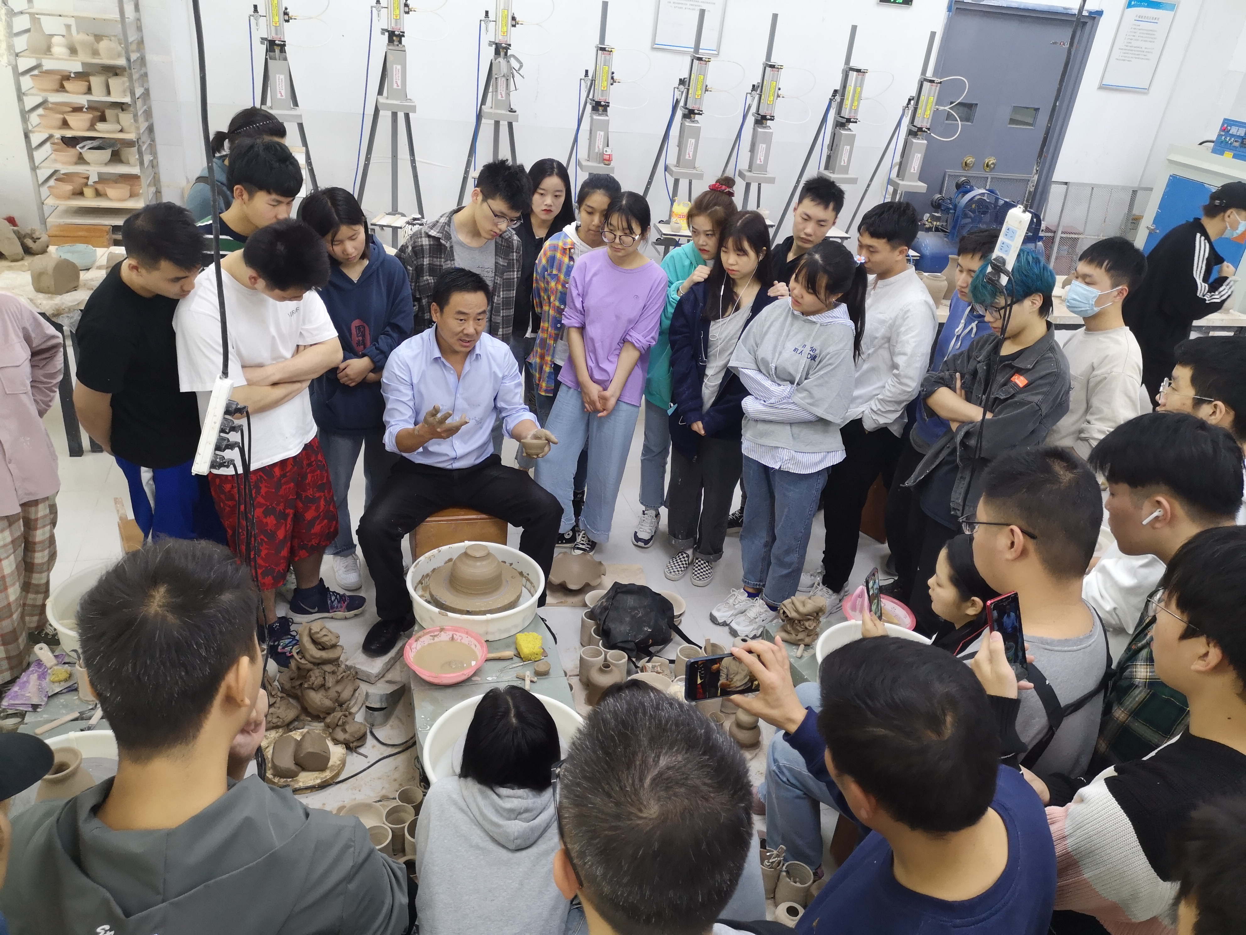 2020年10月28日,艺术设计学院(陶瓷美术学院)陶瓷系邀请河南省五一劳动奖章获得者、全国陶瓷行业技术能手、许昌市非物质文化遗产钧瓷烧制代表性传承人王文珂老师到禹州校区进行了传统拉坯技法讲解与示范,工艺美术专业19级全体师生现场观摩王老师的拉坯技艺。