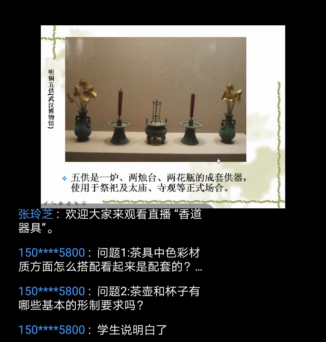 张老师的讲解内容充实、案例生动,以茶和器为主线,从茶、器、人、环境等四个方面的相互关系做了详细的阐释,并结合茶席布置的典型案例,深入分析了茶席中的器物之美——材质、造型、色彩、装饰等,是展示文化品位和内涵的重要内容,更体现了人的审美追求。其中也涉及香器、花器等相关知识和内容。最后,同学们踊跃提问,与张老师积极互动。