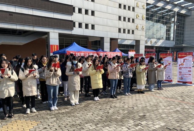12月4日上午,学院法学专业2019级79名学生在科学校区老食堂门口开展了“宪法原文诵读”活动,营造仪式感,让学生感受宪法的威严。“本宪法以法律的形式确认了中国各族人民奋斗的成果,规定了国家的根本制度和根本任务,是国家的根本法,具有最高的法律效力……”铿锵有力的诵读声贯彻校园,师生都在诵读中深深地感受到了宪法作为根本大法的神圣与庄严。