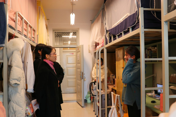 在各宿舍,辅导员老师们对各宿舍的地面、桌面、垃圾桶、床铺以及电器使用情况等方面进行仔细检查,针对检查过程中的不规范行为进行强调和纠正。走访中,张智勤、韩笑老师与学生亲切交谈、嘘寒问暖,指出学生宿舍是大学校园里一个非常微小的“细胞”,勉励同学们:一要强化思想政治引领,以宿舍为抓手建设学习型组织,让宿舍成为学生提高政治觉悟、树立远大理想、坚定崇高信念的学习之地;二要建设积极向上的宿舍文化,培育和弘扬社会主义核心价值观,做到知感恩、讲诚信、行礼仪,形成好学、乐学、善思、修身的生活方式、文明习惯和宿舍文化新风尚;三要提高安全防范意识,严格遵守学校公寓管理制度,提高自身安全意识,注意防火、防盗、防骗、寝室用电安全以及自身财务安全,自觉抵制校园非法传教行为等。