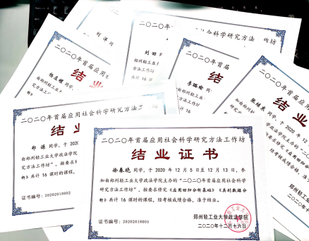 12月18日下午,由政法学院公共事业管理系主办的“二○二○年首届应用社会科学研究方法工作坊”在政法楼103举行了结业仪式。实验实训中心主任郝宏杰、公共事业管理系张绍阳博士、冯华超博士,以及来自社会工作2020级研究生、公共事业管理2018级和2019级的12名学员出席了此次结业仪式。