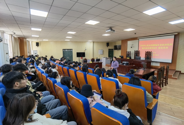 为进一步加强普法宣传,增强师生法律意识和国家安全意识,12月31日中午,政法学院在活动中心楼112模拟法庭开展《中华人民共和国境外非政府组织境内活动管理法》普法宣传活动。政法学院党委副书记刘放美、辅导员栗想和2018级全体学生参加学习。