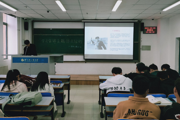 此次团日活动内容主要围绕三个问题分三个层次展开。一是雷锋是谁,雷锋精神是什么。各团支书为大家介绍雷锋同志的生平及主要事迹,通过一个个生动的事例展现雷锋短暂而灿烂的一生以及雷锋精神的深刻内涵。二是什么是新时代的雷锋精神。各团支部组织同学们观看了2020年感动中国人物视频以及全国脱贫攻坚总结表彰大会和全国抗击新冠肺炎疫情表彰大会视频片段。坚守抗疫一线的人民英雄张定宇、为救援群众牺牲在洪水中消防员陈陆、改变山区女童命运的公益校长张桂梅、带领村民脱贫致富的“当代愚公”毛相林等等,他们用自己的行动甚至整个生命,生动诠释了什么是新时代的雷锋精神。视频观看过程中,同学们全情投入,无不为他们信念的能量、大爱的胸怀、忘我的精神、进取的锐气所动容。最后,由团支书带领同学们讨论“弘扬和传承雷锋精神我该怎么做”。大家分享了自己的学习感想以及身边的雷锋故事,纷纷表示今后要自觉做雷锋精神的传承者和践行者,努力在学习、生活和各项工作中处处向雷锋看齐,向榜样学习,积极进取、勇挑重担,服务人民、奉献社会,报效祖国。