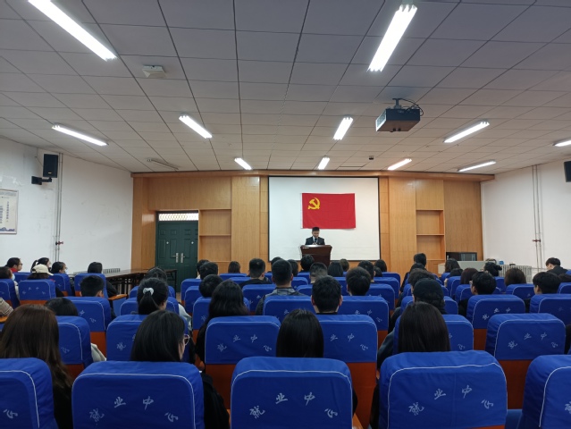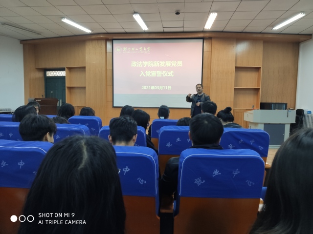 3月11日下午,政法学院在活动中心楼113室举行新发展党员入党宣誓仪式,学院党委书记宋德涛、组织员匡竞、学生党支部书记、79名新发展党员、老党员代表和入党积极分子代表参加,仪式由学院党委副书记刘放美主持。