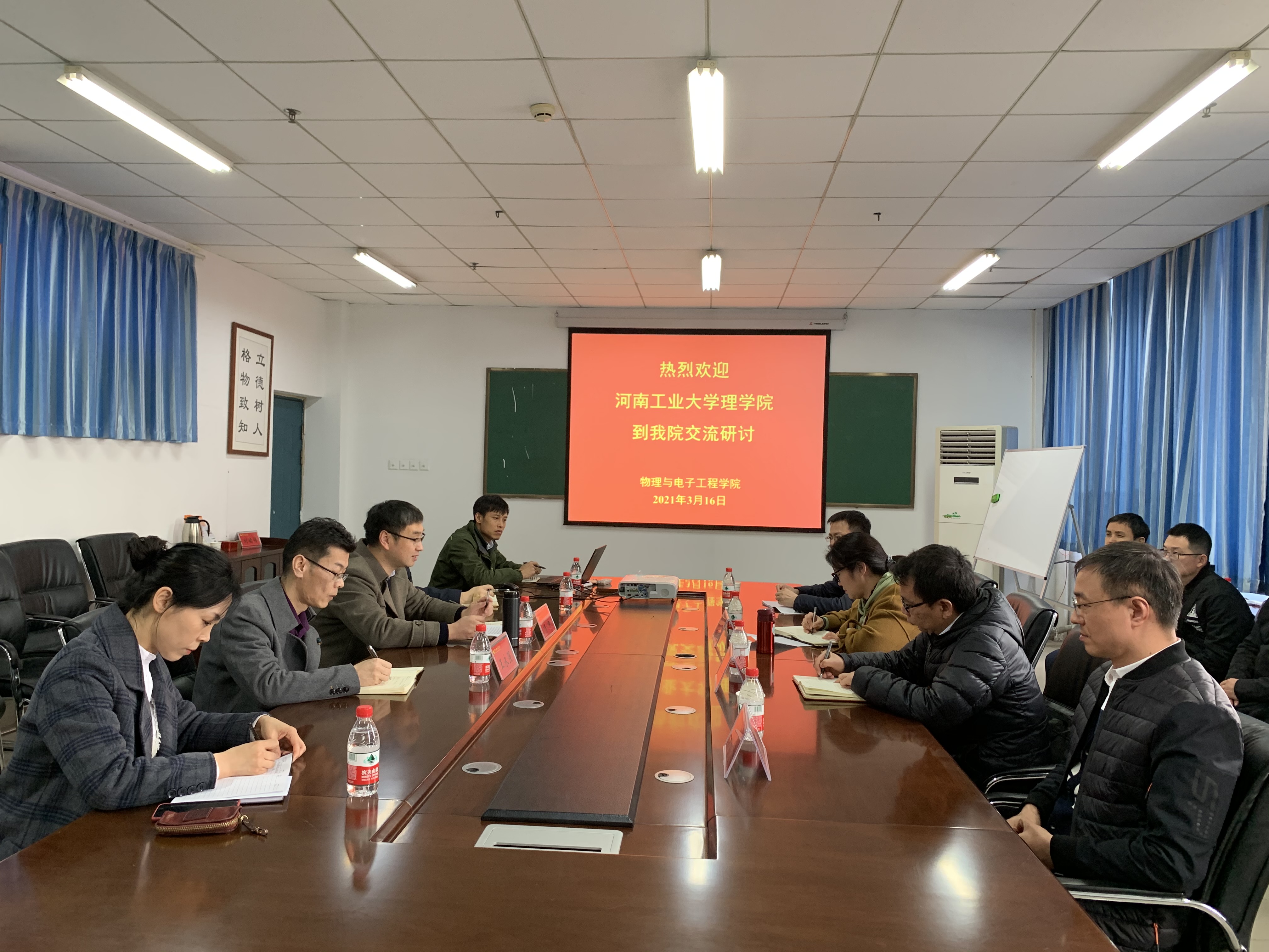 2021年3月16日下午,河南工业大学理学院院长富笑男教授一行11人到物理与电子工程学院进行调研交流。座谈会在四教楼510学术讨论室举行,学院院长杨坤、副院长王永强、物理实验中心和实验实践教学中心负责人参加了座谈会。