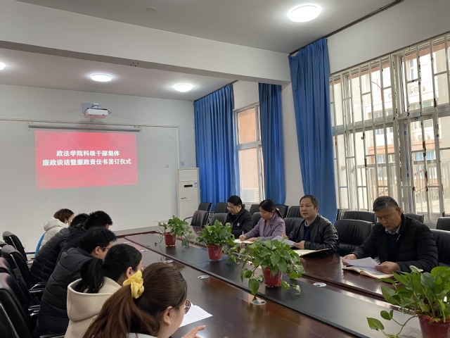3月18日下午,政法学院党委在政法楼212会议室举行科级干部集体廉政谈话暨廉政责任书签订仪式。学院全体党政班子成员,全体科级干部参加会议,会议由副书记刘放美主持。