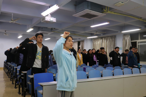 张老师以“心中有信仰,脚下有力量”为主题,带领大家重温了中国共产党从建党到现在的发展壮大历程。采取“自然渗透,润物无声”的方式,讲述了五四运动和中国共产党的成立是中国革命历史上重大的历史事件,影响了以后中国革命的历史进程,以增强学生的理想信念、文化自信、责任担当;讲述了中国共产党团结带领中国人民创造的红船精神、长征精神、延安精神等革命精神,引导学生坚定理想信念,厚植爱国主义情怀。最后,重温入团誓词,铭记初心使命。“我志愿加入中国共产主义青年团,坚决拥护中国共产党员的领导,遵守团的章程,执行团的决议,履行团员义务……”在鲜红的团旗下,在场全体成员庄严举起右拳,温誓词、忆初心,一字一句,铿锵有力,催人奋进。