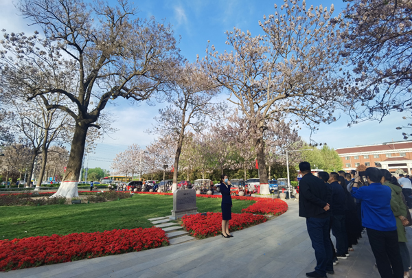 在焦桐广场,焦桐花开,大家认真聆听关于焦桐树的来历和当年焦书记带领兰考人民与灾害进行顽强斗争,努力改变兰考面貌的光辉事迹。大家近距离感受到焦裕禄同志给兰考留下的精神财富。