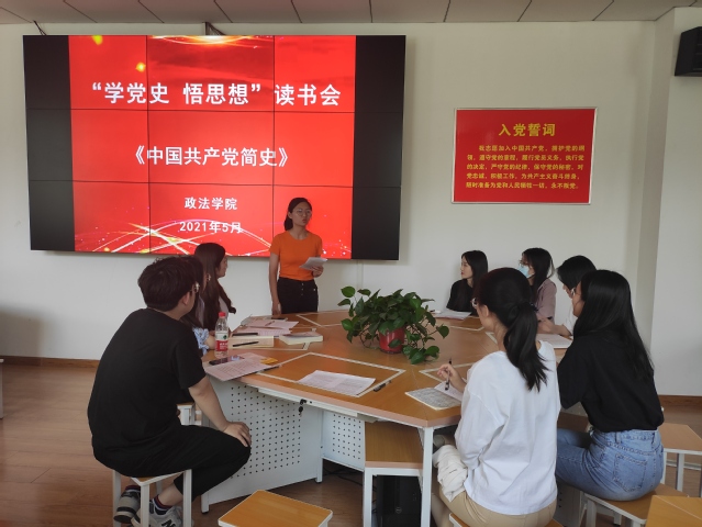 为庆祝中国共产党成立100周年,推进党史学习教育,5月7日下午,政法学院组织学生党员在政法楼100室开展“学党史,悟思想”读书会,本次读书会选读的书籍为《中国共产党简史》,读书会由本科生第二党支部书记刘栩静主持。
