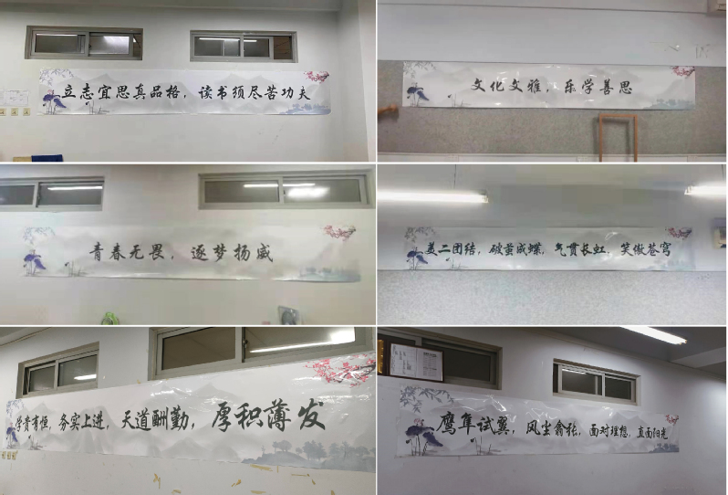班级口号和班训都是班级文化的一种表现形式,能够成为无时无刻激励学生进步的思想动力,是德育教育的一块沃土。首先,活动以班级为单位,收集班级口号及励志名人名言,要求能够积极反映班风班貌,体现班级氛围,形成班级凝聚力。同学们通过多次谈论,选出最符合班级特色的口号,之后张贴于班级内部。