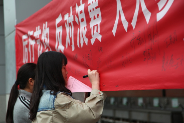本次活动主要分为两个部分,一是志愿者们提前根据该法律主要内容制作宣传页,并通过发放宣传页,现场讲解的方式向同学们介绍反食品浪费法的主要内容;二是开展“厉行节约,反对浪费,人人参与,从我做起”签名活动,请同学们在了解相关法律条款内容后在本次活动宣传条幅上签名,承诺杜绝食品浪费行为。活动进行过程中,志愿者们积极踊跃,讲解内容清晰明了,通俗易懂,吸引了大量同学驻足聆听并主动在条幅上签下自己的姓名,纷纷表示要弘扬中华民族勤俭节约传统美德,以身作则,反对浪费。