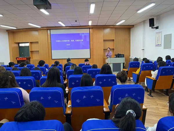 报告中,曾教授用详实的数据、生动的案例,从劳动力供给下降、平台型就业发展、结构性矛盾持续和不确定因素加大四个方面深刻阐释我国人力资源市场的新变化、新挑战,同时就数字文化产业与就业、大学生胜任能力要求、延迟退休与老年人力资源开发、非认知能力等前沿和热点问题分享了自己的深入思考与独到见解。报告紧扣当下社会发展关键议题,内容新颖,资料丰富,兼具理论深度与民生温度,使在场师生深切感受到这位资深学者渊博的学术修养、严谨的治学态度和强烈的人文精神。讲座中,曾教授还与师生进行了热烈互动,对师生的提问一一给予耐心解答,赢得一致好评。