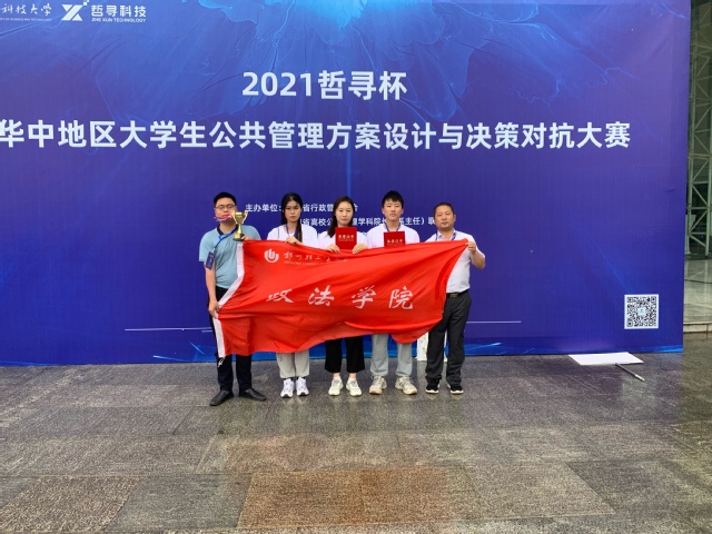2021年5月21日-23日,首届“哲寻杯”华中地区大学生公共管理方案设计与决策对抗大赛在武汉举办。我校政法学院宋德涛、郝宏杰老师指导的由公共事业管理专业2019级三名学生组成的“齐心筑梦队”参加比赛,并取得优异成绩。