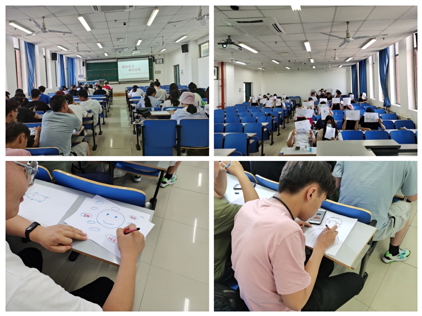 此次活动包括“我的自画像”和“压力圈圈”两个部分组成。其中“压力圈圈”给同学们分发了纸以及彩笔等用具,根据自己意愿画出或写出心中所想的压力内容,让同学们更好的了解到自己的压力来源;“我的自画像”通过在白纸上用彩笔画出内心所想的东西,分享给他们画的内容以及想要表达的意思。同学们在绘画的过程中,进行了深入的自我分析,在分享环节中相互鼓励,积极交流,活动取得了良好效果。