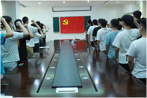 活动在庄严的《国际歌》中开始,全体党员佩戴党员徽章,在领誓人徐莉同志的带领下,面向党旗,高举右拳,郑重宣誓。嘹亮的誓言徘徊在会议室中,全体党员在党旗下再次接受心灵的净化和洗礼。重温入党誓词结束后,本科生党员李刚同志用微党课形式与大家交流分享了党史学习心得,表示要牢记初心使命,学党史,将奉献,永远跟党走。