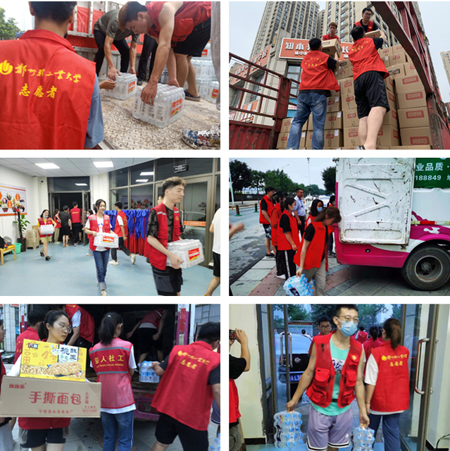 7月22日上午,政法学院师生了解到郑州市高新区益人社会工作服务中心正协同爱德基金、壹基金开展救灾活动,急需志愿者发放物资。接到志愿服务函,政法学院师生积极响应,不到半小时,志愿者就征集完毕。下午,政法学院冯华超老师带领27名志愿者来到万和城社区党群服务中心,为停水停电三天的重灾区万和城社区搬运发放生活物资。随着一车车救灾生活物资的到来,志愿者们将救灾生活物资从车上一箱箱搬下来。虽然工作很辛苦,但志愿者们干劲儿十足,从下午持续奋战到将近晚上11点。经统计,一共搬运了1900件水,一百余箱面包等食品,受益群众1000余人。大家纷纷表示 “虽然身体很累,但心里满满的,就连出的汗也觉得是甜的!”,社区的居民受到学生志愿者的影响,纷纷帮忙装卸救灾物资。