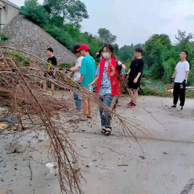 在郑州, 2018级的邹勇、罗佳等几位同学配合社区工作人员,对住户进行调查走访,耐心宣讲政策,做好灾后安抚和需求调查工作;2020级的王雨童同学参与了登封书院河的河道清理。在新乡,2019级尚书雨、乔一以及2020级范林静三位同学则不约而同的在卫河边参与捆绑沙袋,筑牢堤坝,还参与为救灾队伍运送食品物资。在南阳,2020级张钿昊同学在南召鸭河边参与了人员疏散警示工作。
