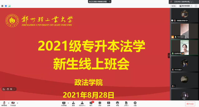 8月28日上午,政法学院召开2021级法学专升本新生线上班会,政法学院党委副书记刘放美、副院长栗志强、教务员王爱芳、辅导员匡竞及全体2021级法学专升本新生参加。