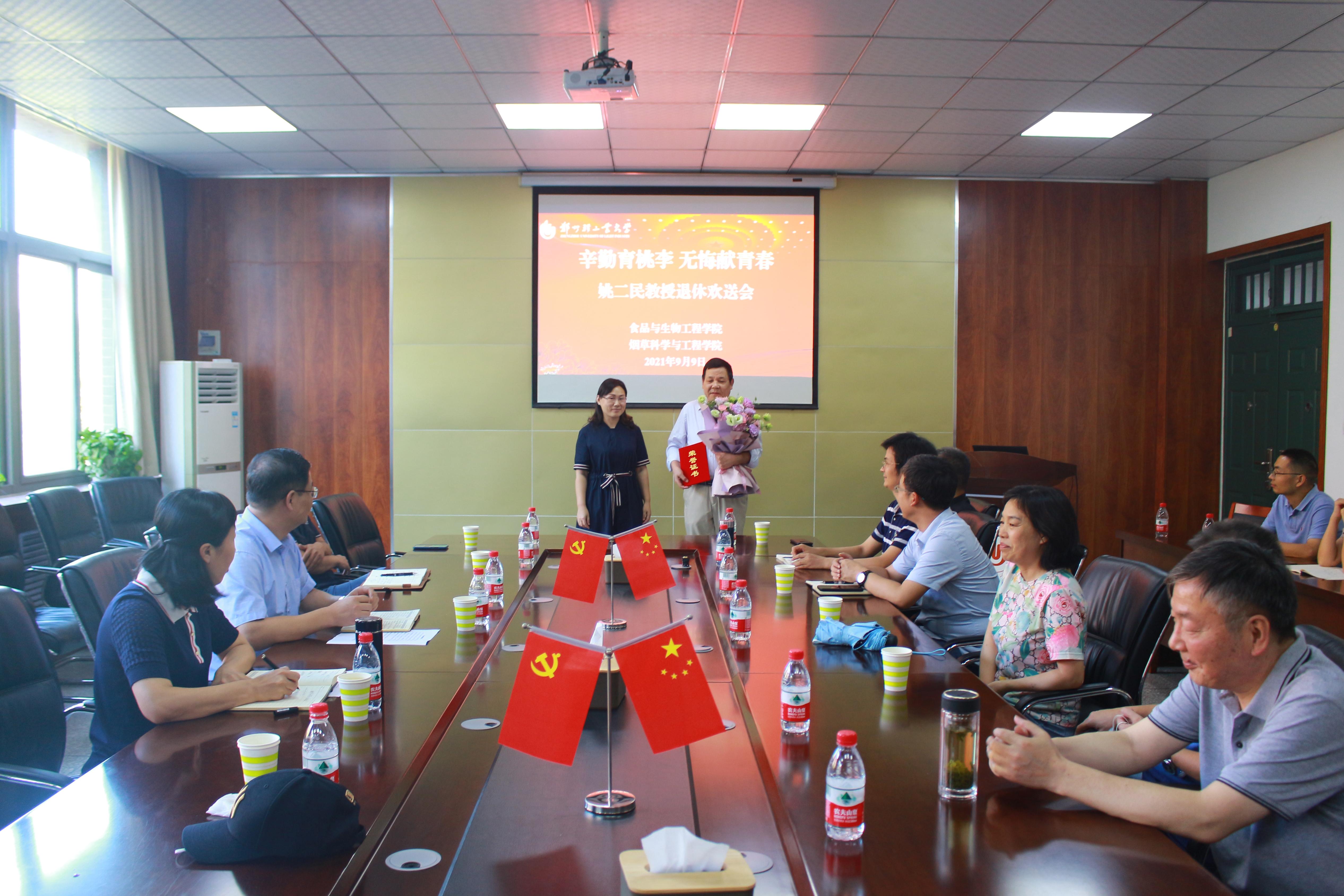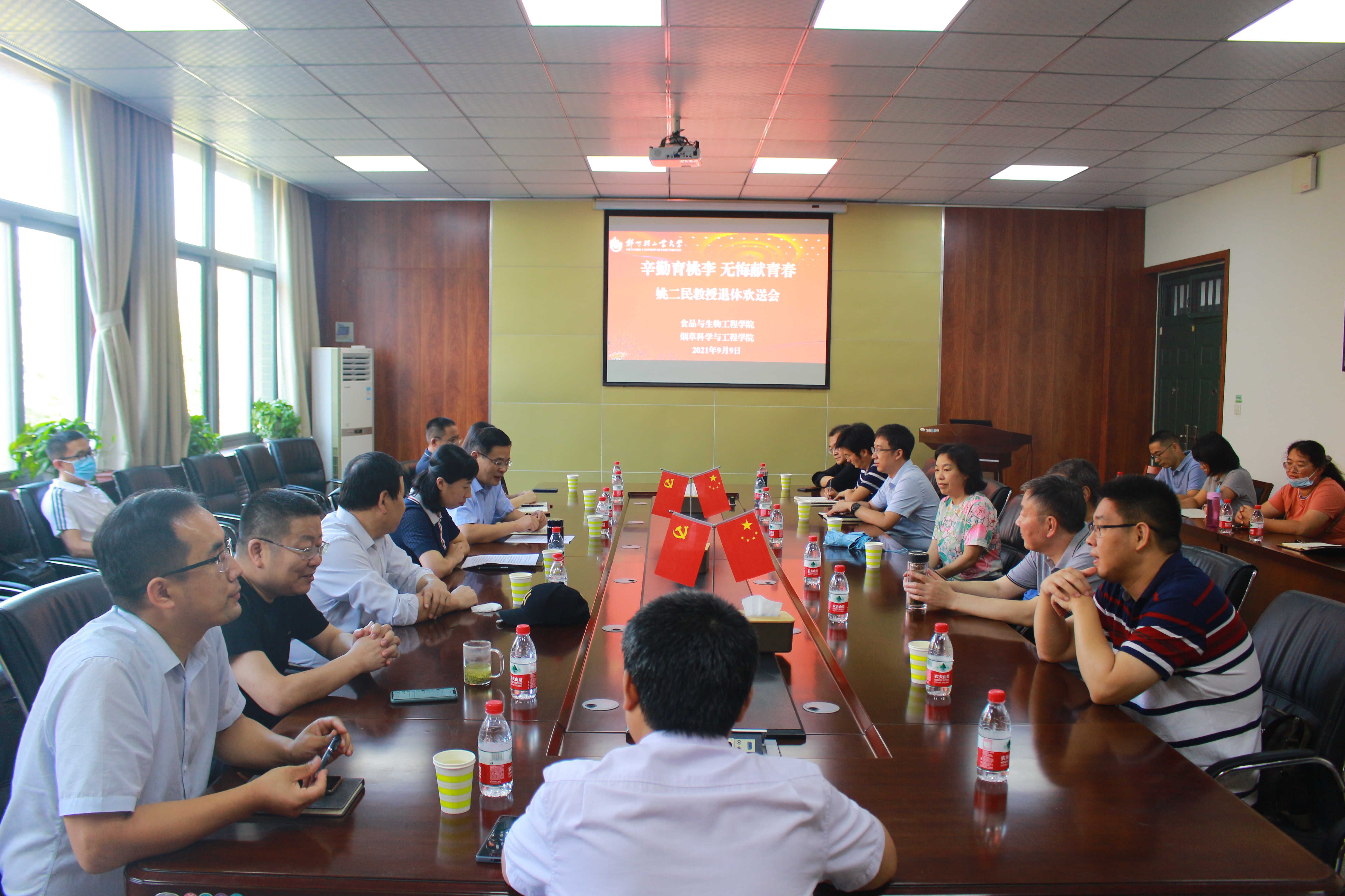 为进一步加强师德师风建设,大力弘扬尊师重教的浓厚氛围,表达对教师的敬意与感谢, 9月9日下午,食品与生物工程学院围绕第37个教师节“赓续百年初心,担当育人使命”主题,在食工楼211会议室举办教师座谈会暨教师光荣退休仪式。退休教师姚二民,学院班子成员、系主任及教师代表参加了此次座谈会。会议由学院党委书记张阳主持。