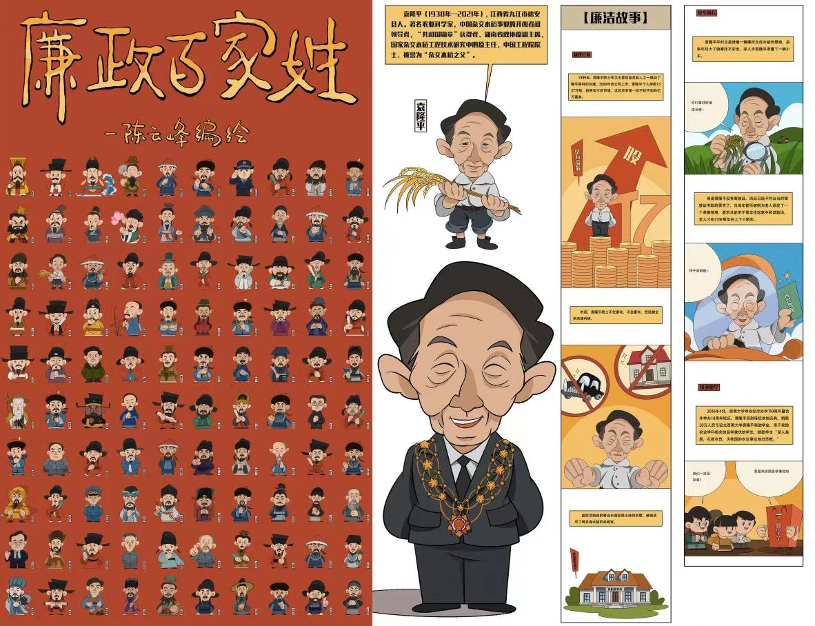 在最终入围的百部优秀作品中,我校艺术设计学院教师陈云峰的系列漫画作品《廉政百家姓》凭借其鲜明主题,积极的教育意义,与生动的漫画形象,在众多作品中脱颖而出,成功入选。《廉政百家姓》围绕中国百家姓氏选取每个姓氏中有代表性的廉政人物,以漫画的方式绘画廉政故事,以漫画特有轻松的阅读方式融合历史故事传达中国清正廉洁的价值观念。