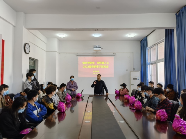 11月18日下午,政法学院在政法楼212室举办“情系考研生,关怀暖人心”考研学子考前动员暨慰问会。学院党委书记宋德涛、副书记刘放美、毕业班辅导员一起为学院2018级本科及2020级专升本158名考研学子发放慰问品以表示学院对考研学子的关心、鼓励和祝福。
