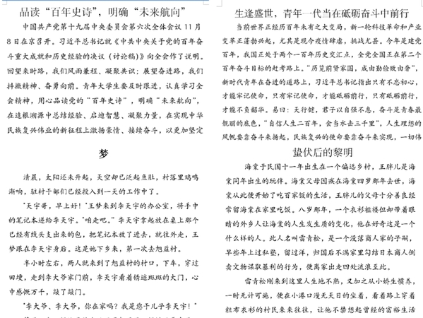 此次征文比赛得到了同学们的广泛关注和积极参与,大家围绕“请党放心,强国有我”主题,追忆百年党史,并结合自己对十九届六中全会精神和河南省第十一次党代会精神的理解与感悟,认真撰写文稿,踊跃报名参赛。经初步筛选共69篇进入最终评奖环节,征文体裁涉及散文、诗歌、小说等。同学们用文字追根溯源,聆听习近平总书记的讲话,见证党的领导下生活翻天覆地的变化;同学们砥砺初心,畅谈身为新时代青年应当如何交接好时代的接力棒;表明自己沐浴在党的伟大成就和精神光辉中,努力创新、大胆开拓,勇担时代使命的决心;承诺要接续奋斗,以更加坚定的理想信念、更加昂扬的奋进状态,为成长为担当民族复兴大任的时代新人而努力。每份参赛作品都饱含了同学们燃烧青春为党和国家奋斗的热情,以及发愤图强为梦想努力的精神风貌。最终,经学院评审小组讨论与筛选,评选出一等奖3名,二等奖4名,三等奖5名。