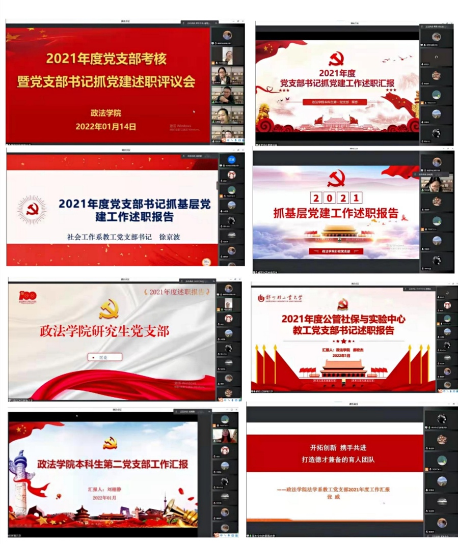 2022年1月14日,政法学院党委组织召开2021年度党支部书记抓党建述职评议会,学院党委委员、党支部书记和党员群众代表参加。会议以线上汇报形式召开,由学院党委书记宋德涛主持。