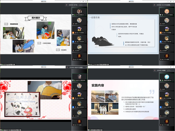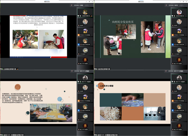 寒假期间,学院围绕“豫见新一代”主题教育实践活动的要求,结合疫情现实和冬奥背景等,组织返乡学生积极投身各类社会实践和志愿服务中,用实际行动践行雷锋精神,展现青春担当。在此次分享活动中,先进代表们现身说法,通过PPT的形式汇报了自己在实践服务中的所作所为所思所获。有的同学分享了自己在当地参与疫情防控工作的经历,面对家乡的突发疫情他们不惧风雨,挺身而出,或在当地疫情防控卡点执勤值岗,或同社区人员进行居民信息调查,或协助医护人员完成全民核酸检测,让青春在抗疫一线绽放光彩;有的同学分享了自己响应家乡号召,参与“线上爱心助学,让爱在线上传递”活动的情况,他们通过精彩的课程向留守儿童传播科学文化知识、传递温暖与关爱;还有的同学分享了自己参加“云支教,迎冬奥“志愿服务活动的经历,在活动中,他们与中小学生一起看冬奥、云阅读、过奥运年、运动打卡等,向孩子们讲好中国故事,传递奥运精神,坚定文化自信……一个个实践故事充分展现了我院学子乐于奉献、勇于担当、奋发有为的精神风貌。